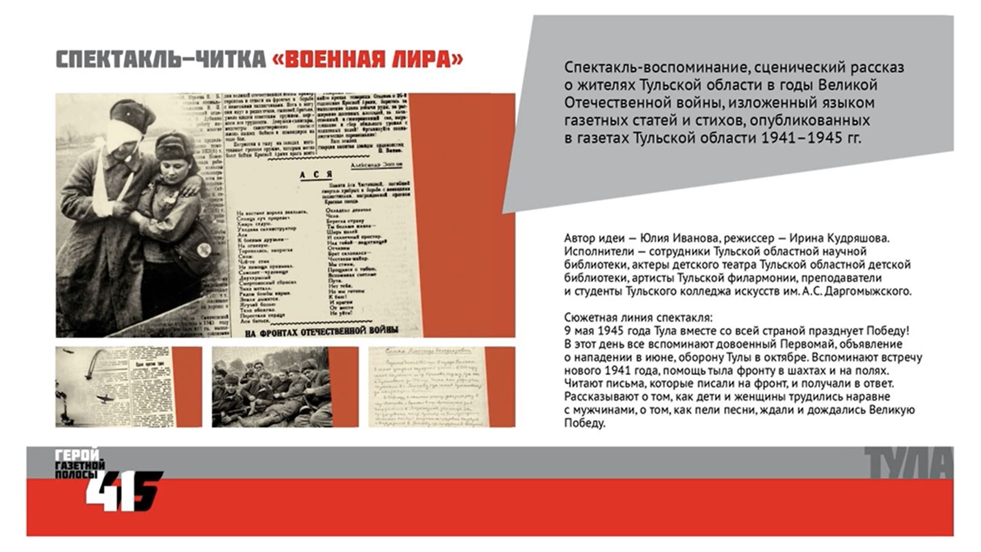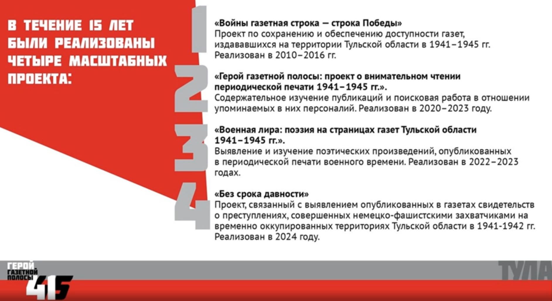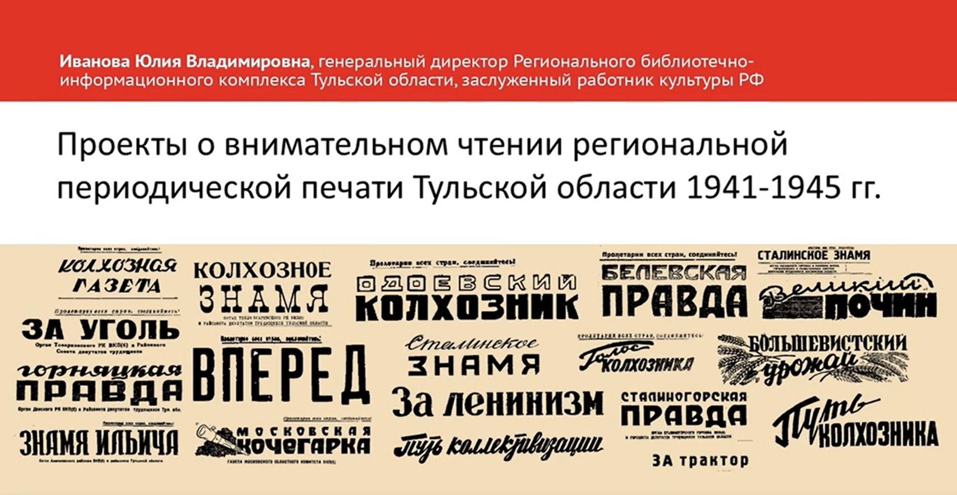 Генеральный директор РБИК И.В. Иванова выступила в видеоформате с докладом «Проекты о внимательном чтении региональной периодической печати Тульской области 1941-1945 гг.». Юлия Владимировна рассказала о всех этапах работы с региональными газетами военного времени: создание удобного и доступного цифрового архива (проект «Войны газетная строка – строка Победы»), поисковая работа (проект «Герой газетной полосы»), поиск и публикация поэтических произведения (проект «Военная лира»), публикация свидетельств о зверствах фашистов на оккупированной территории (проект «Без срока давности»). В следующем году будет отмечаться 85-летие героической обороны Тулы, и сотрудники Тульской областной научной библиотеки уже думают над новым проектом.