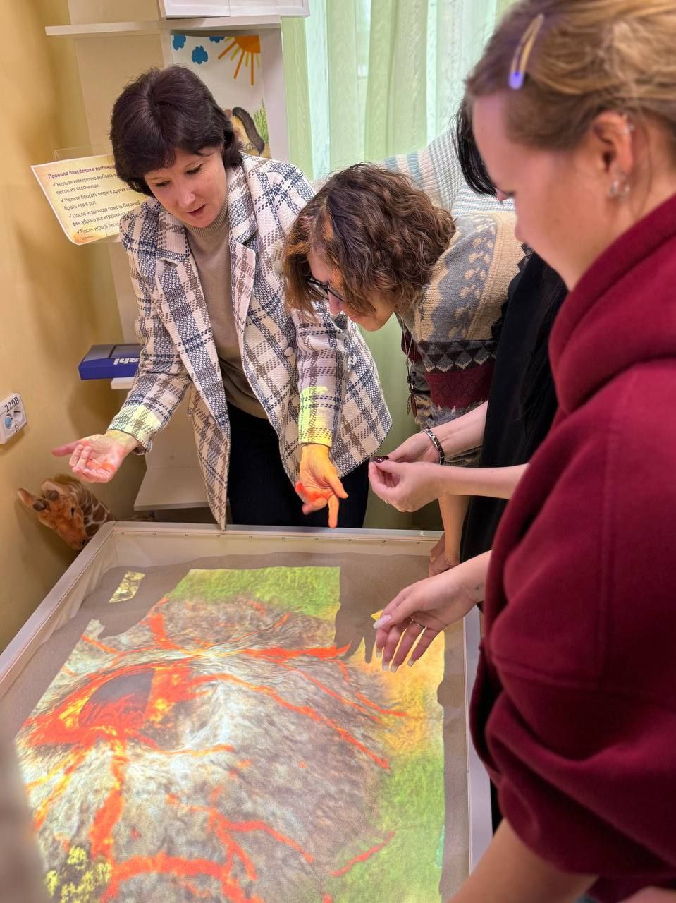 В секторе по работе с детьми и организации досуга они узнали о тактильных рукодельных книгах и дидактических пособиях для тренировки мелкой моторики, которая очень важна для изучения чтения и письма по Брайлю. Самым увлекательным стало общение с интерактивной песочницей, которая имеет программы дополненной реальности.