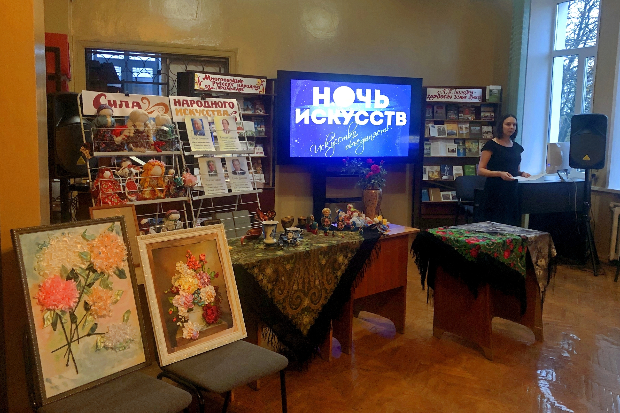 В муниципальных библиотеках Тульской области были подготовлены музыкальные и поэтические встречи, выставки, марафоны, народные праздники. Кимовская центральная районная библиотека, ставшая в этом году модельной, объединила людей разного возраста: юных читателей, представителей общественности, педагогов, талантливых и увлеченных людей, всех кто любит музыку, поэзию, литературу. На вечере звучали звуки скрипки, саксофона, фортепиано в исполнении воспитанников и преподавателей Детской школы искусств, стихи и песни – от участников акции и творческих коллективов. В Одоевской районной библиотеке состоялся фольклорно-музыкальный праздник «Живая нить традиций» с воссозданными обрядами русского народа. В Плавской центральной библиотеке прошла творческая встреча-марафон искусств «Творение души и рук». Вечер создал атмосферу живого общения между мастерами и зрителями. Гости праздника познакомились с их творческими работами и уникальным опытом. Участниками акции в Богородицкой межпоселенческой библиотеке стали члены клуба «Вдохновение» и друзья библиотеки. Они познакомились с выставкой народных художественных промыслов, историей возникновения русских народных хореографических традиций. В библиотеках Венёвского района участники акции отправились в путешествие сквозь время и культуру. В Арсеньевской межпоселенческой библиотеке прошла литературная гостиная «Россия единством крепка». Участниками экскурса в историю «Духовное сокровище – русская культура» Киреевской районной библиотеки стали старшеклассники Киреевского центра образования. В Чернской межпоселенческой библиотеке прошла игра-викторина «Народные приметы» и мастер-класс по росписи матрешек.