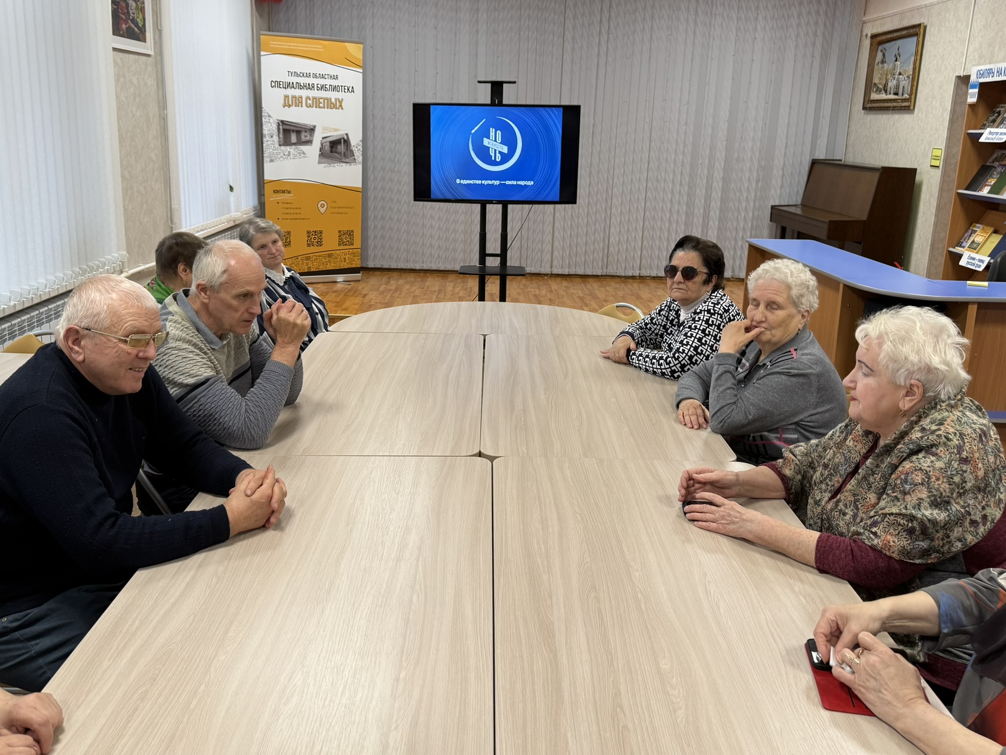 В инклюзивном кинозале «Кино без границ» Тульской областной специальной библиотеки для слепых показали музыкальный художественный фильм «Зимний вечер в Гаграх» с тифлокомментаримем, гостям рассказали о прототипе главного героя Алексее Беглове, легендарном танцоре-чечёточнике, кумире эстрады 1950-х годов.