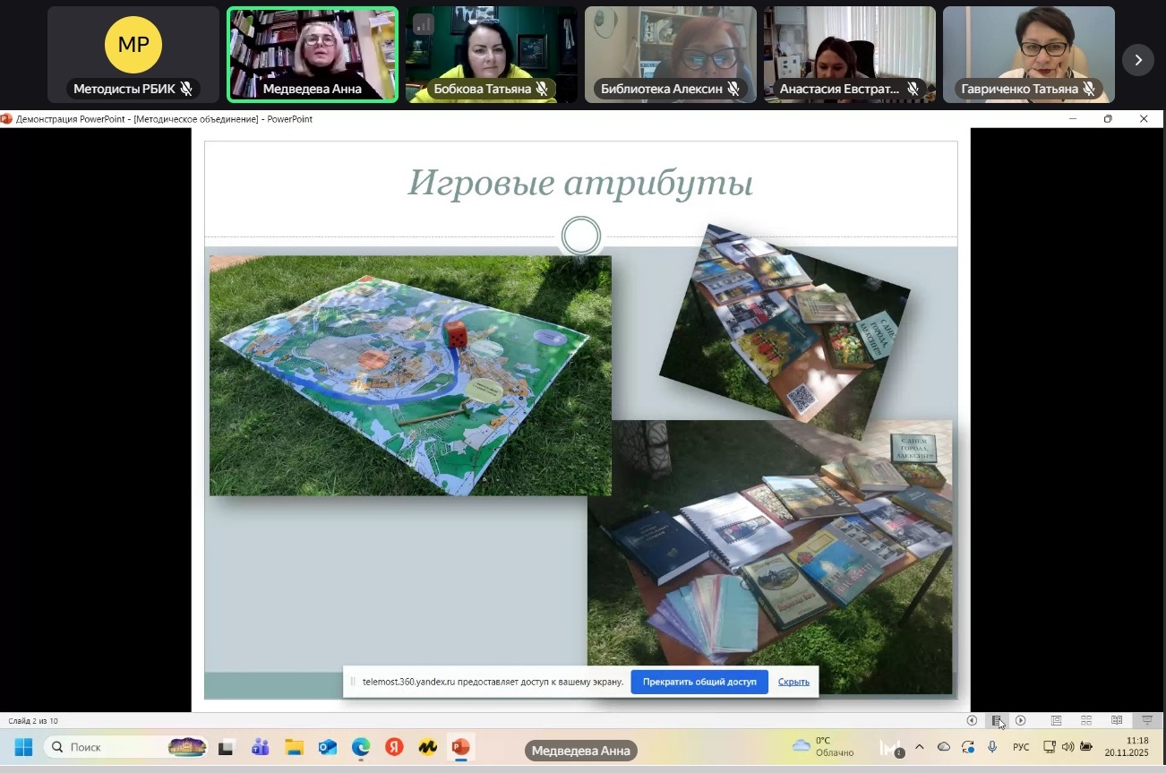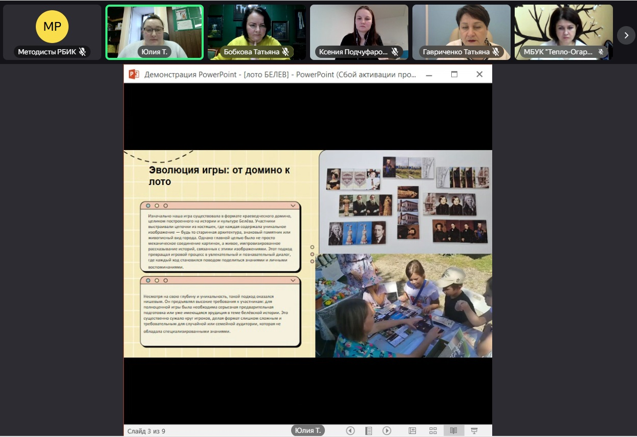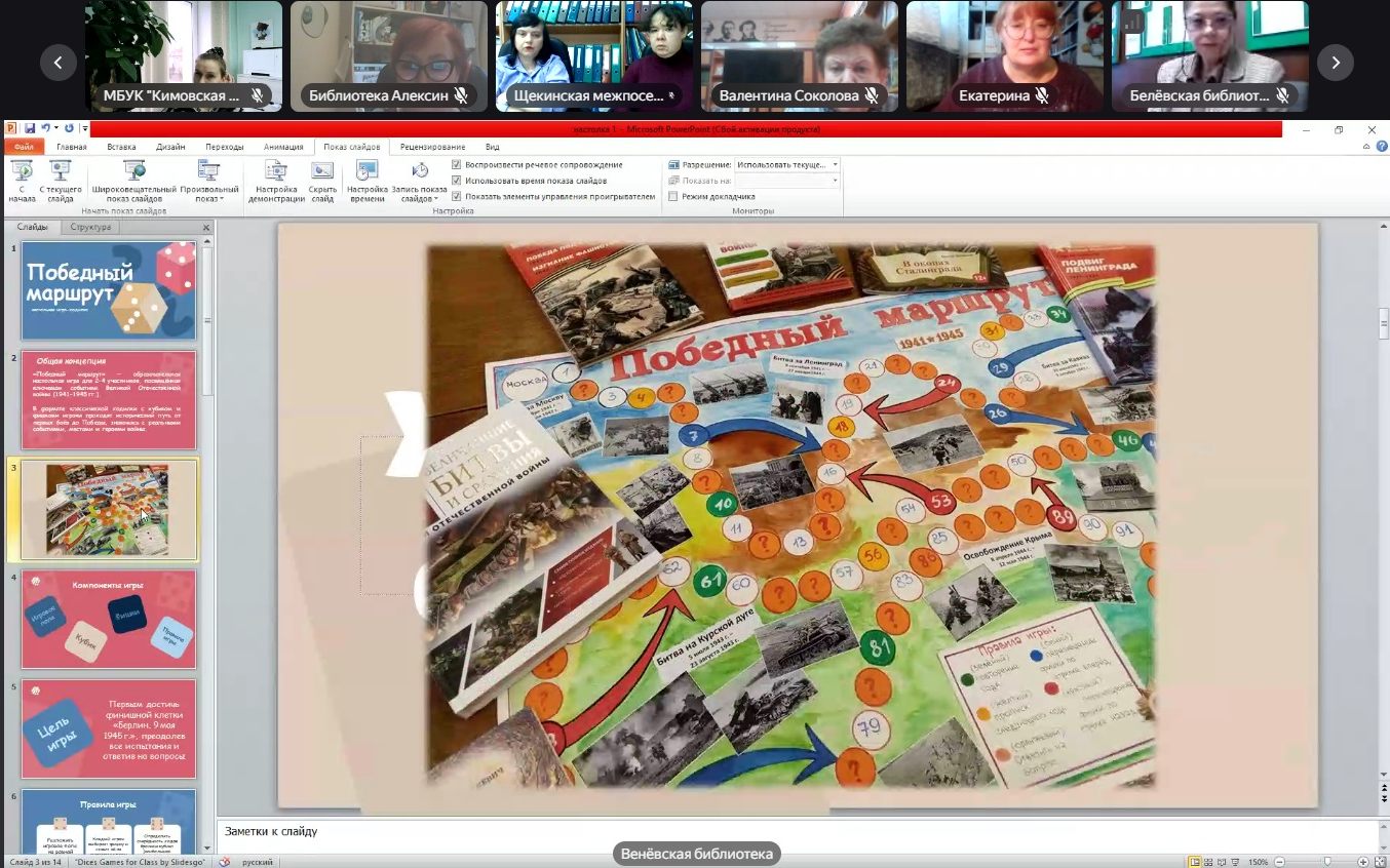 Сотрудники муниципальных библиотек представили методики создания собственных библиотечных настольных игр. С презентациями об интересных разработках, подробным описанием создания и проведения игр выступили: Подчуфарова К.В., библиограф Первомайской поселенческой библиотеки Щекинского района, Терехова Ю.А., методист Белевской межпоселенческой библиотеки, Саморукова Е.С., зав. методико-информационным отделом Веневской библиотечной системы, Мартынова Е.А., зам. директора Ясногорской библиотечной системы, Медведева А.И., заведующий справочно-библиографическим отделом Алексинской центральной городской библиотеки. Опыт коллег был положительно оценен присутствующими на мероприятии.
