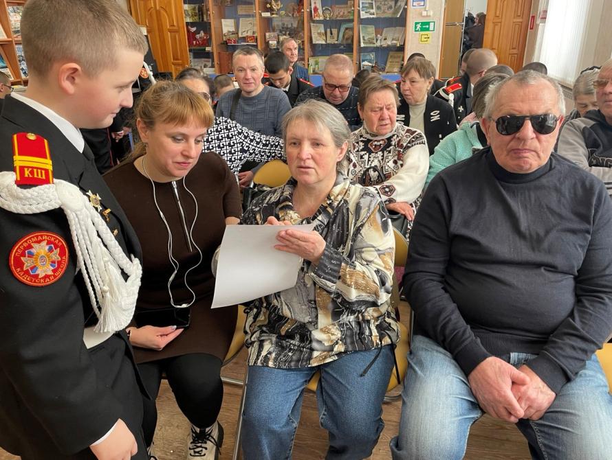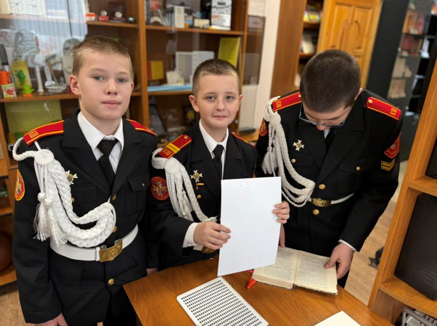 Перед концертом кадеты знакомились с библиотекой для слепых и общались с читателями. Вместе рассматривали книжно-иллюстративную выставку «О Родине. О мужестве. О славе», на которой представлены специальные форматы изданий, в том числе краеведческих, о боевом прошлом и настоящем нашей армии и флота, о защитниках Отечества. Затем сыграли в адаптивные игры – шашки и кубик Рубика. Но больше всего их впечатлило письмо по системе Брайля. Кадеты записали брайлевским шрифтом несколько добрых слов и пожеланий и подарили читателям библиотека.