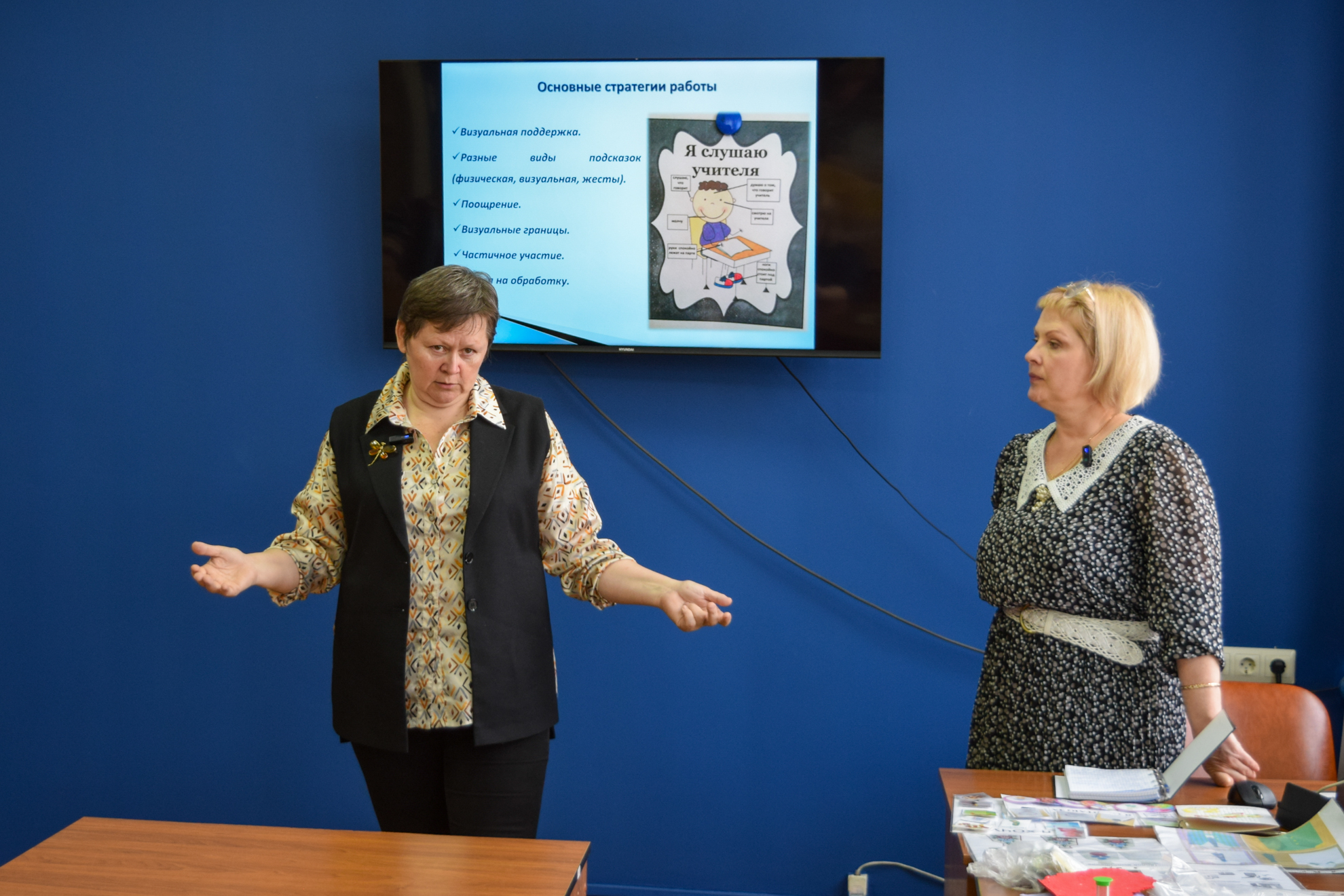 Сотрудник тульского «Валеоцентра», педагог дополнительного образования Инна Матвеева перечислила основные стратегии работы с людьми с РАС — в первую очередь, с детьми. Это визуальная поддержка, подсказки, поощрение, время на обработку информации и другие.