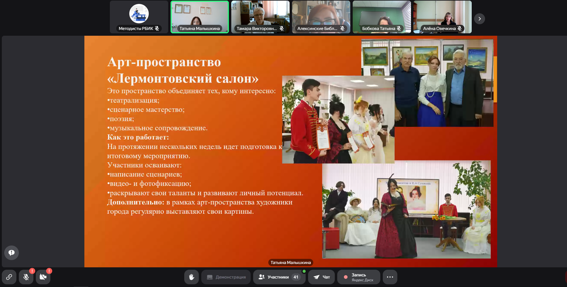 Третий блок: как библиотеки привлекают жителей через точки концентрации талантов. О реализации всероссийского проекта «Гений места» рассказали его кураторы из Ефремовской центральной модельной библиотеки им. М. Ю. Лермонтова Т. В. Малышкина и Новольвовской сельской модельной библиотеки Кимовского района М. Ю. Маренова. Они отметили, что имя даёт библиотеке наследие и идентичность, гранты — ресурс и дисциплину, а «Гений места» — среду для креативных продуктов. Вместе они превращают библиотеку в точку притяжения территории.